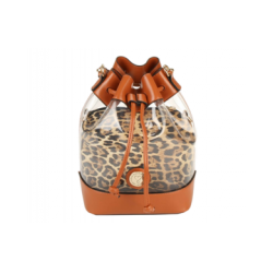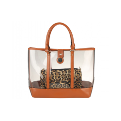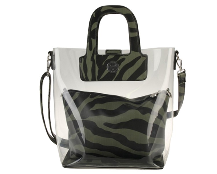 Bolso shopper de vinilo transparente combinado con estampado cebra kaki y negro.