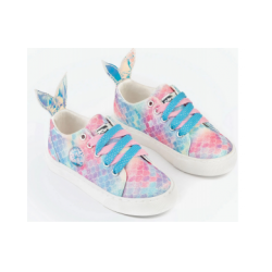 Zapatillas de niña sirena multicolor Estas bonitas zapatillas tienen el detalle de la cola iridiscente en la zona del talón, así como cordones de colores rosa y azul al tono con el estampado de escamas. Además en el lateral tiene una burbuja de agua con purpurina azul que se mueve con cada paso como las olas del mar.