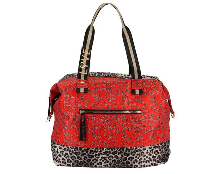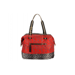 Bolsa estilo weekend con estampado animal print combinado con rojo. Es un diseño con cierre cremallera y bolsillo exterior.