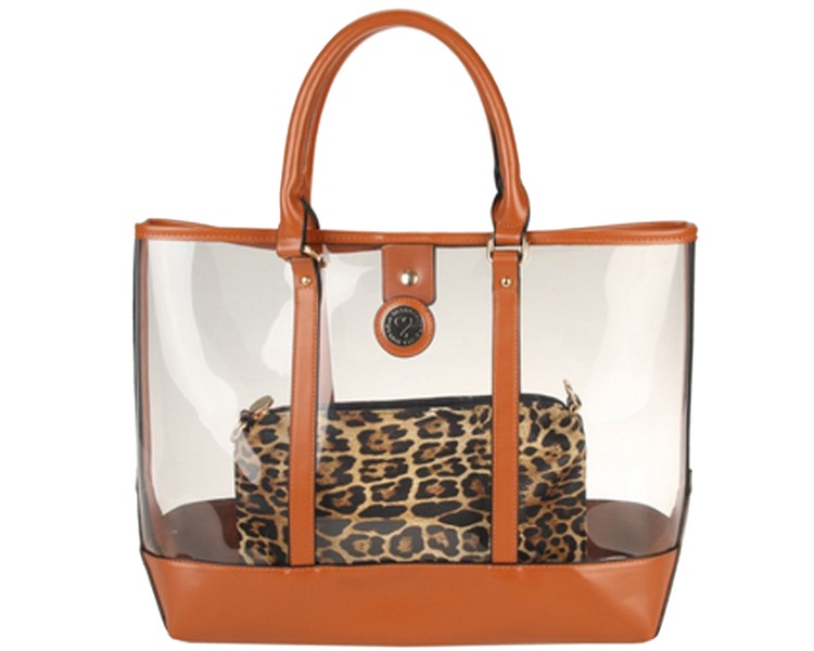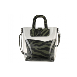 Bolso shopper de vinilo transparente combinado con estampado cebra kaki y negro.