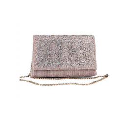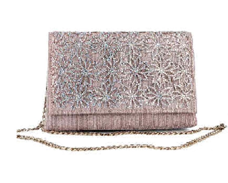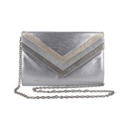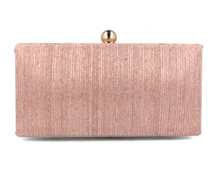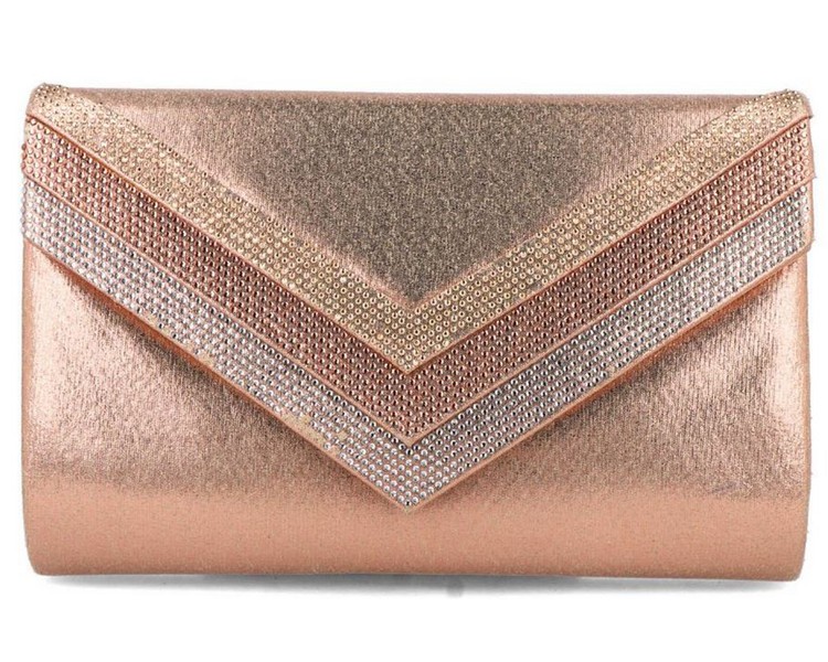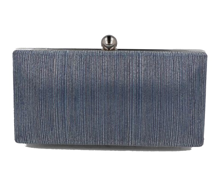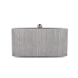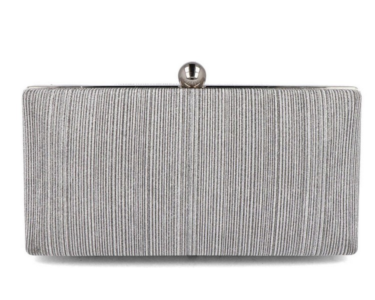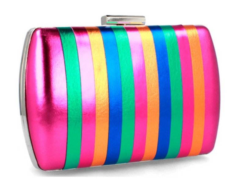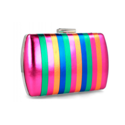 Bolso de fiesta tipo clutch pequeño con forma ovalada y estampado de rayas multicolor efecto metalizado.