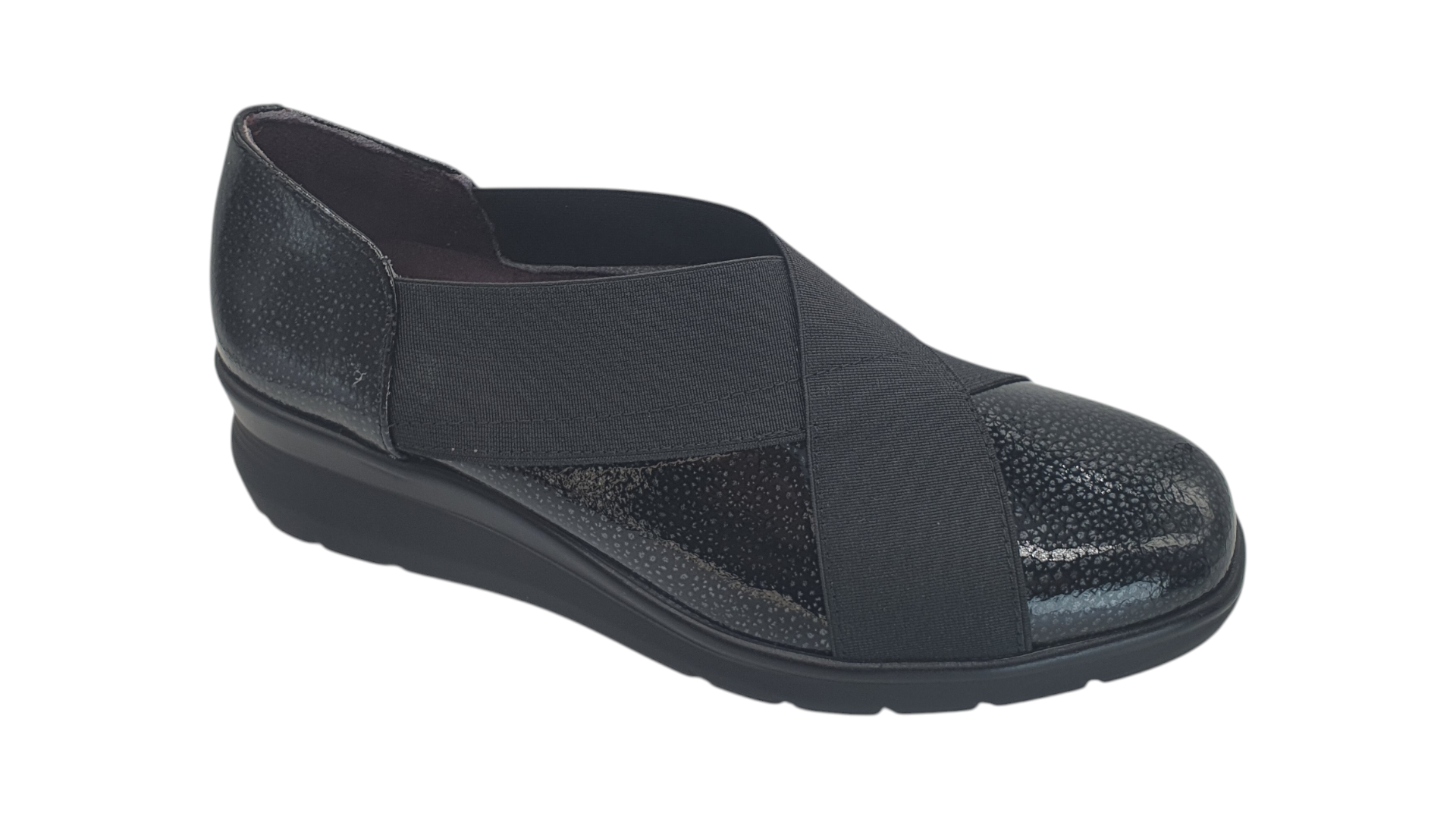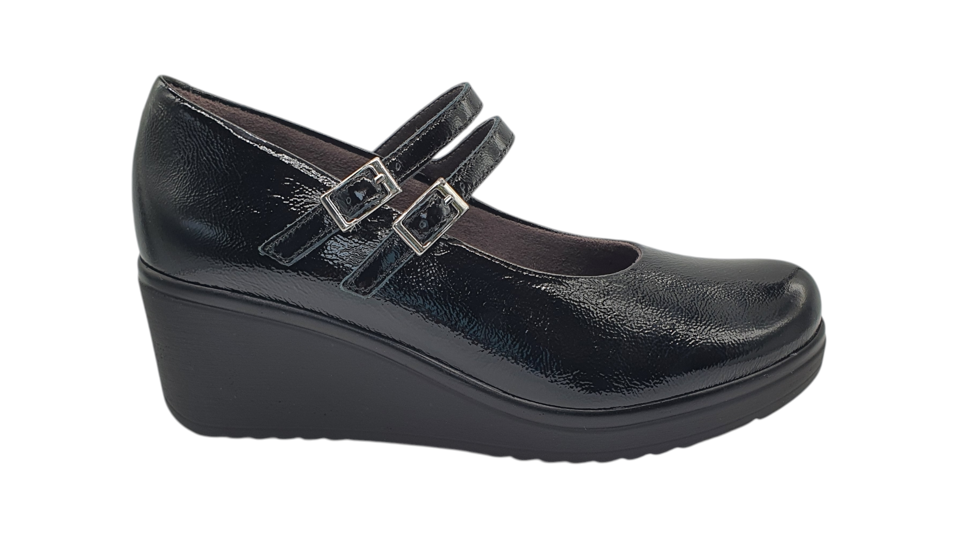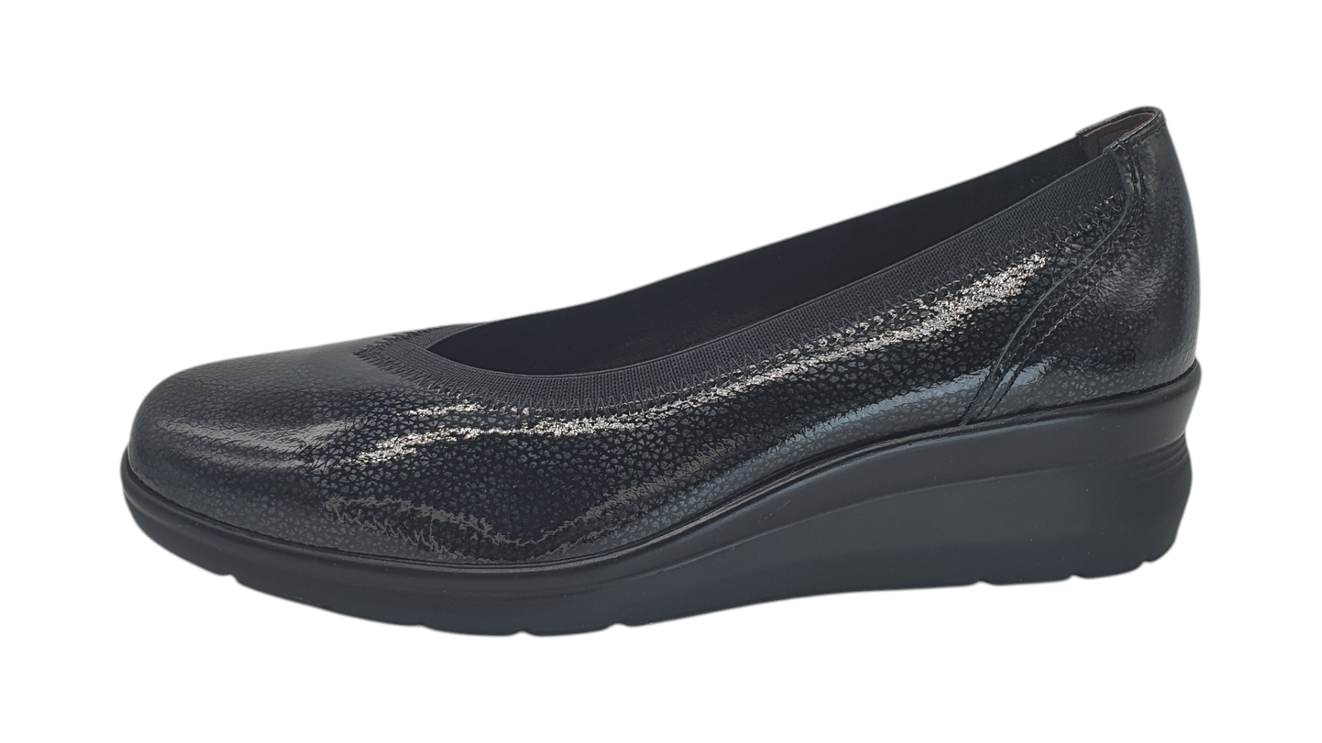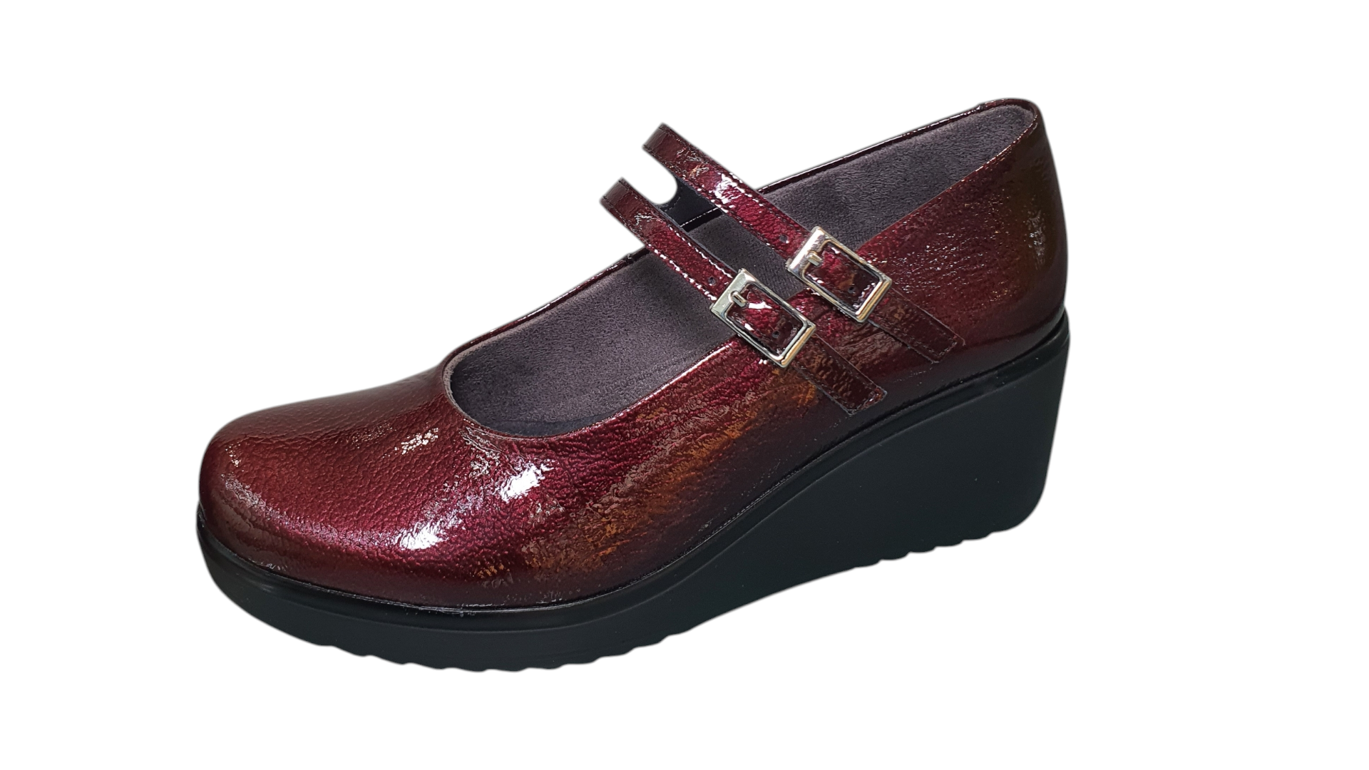 Zapato de mujer tipo mocasín, con gruesa suela de 5 cm de goma. Fabricado en material que imita al charol.