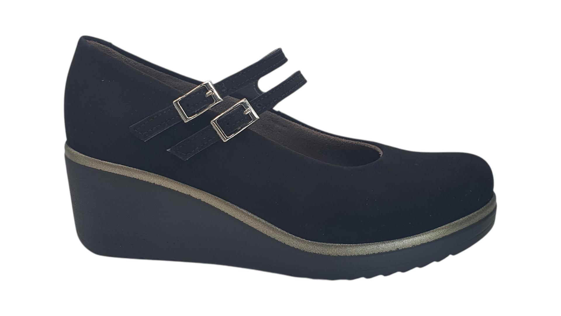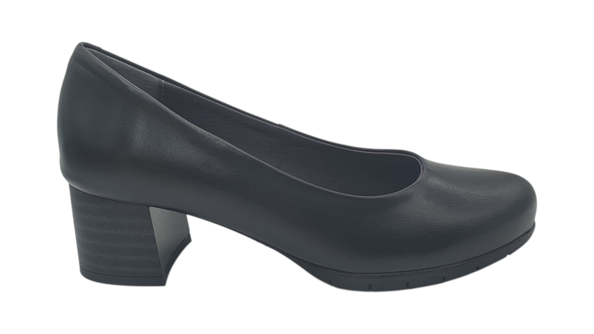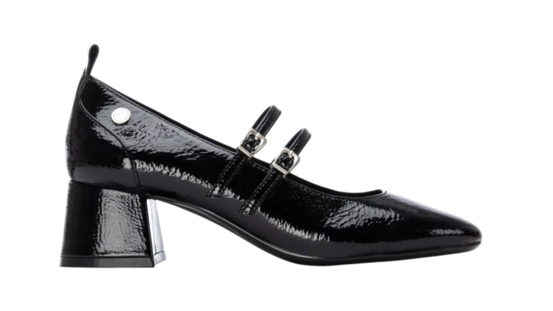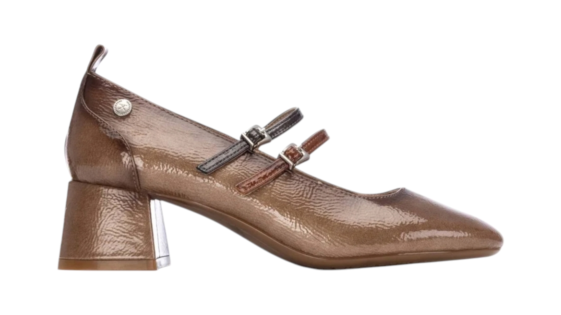 Zapato de mujer tipo mocasín, con gruesa suela de 5 cm de goma. Fabricado en material que imita al charol.